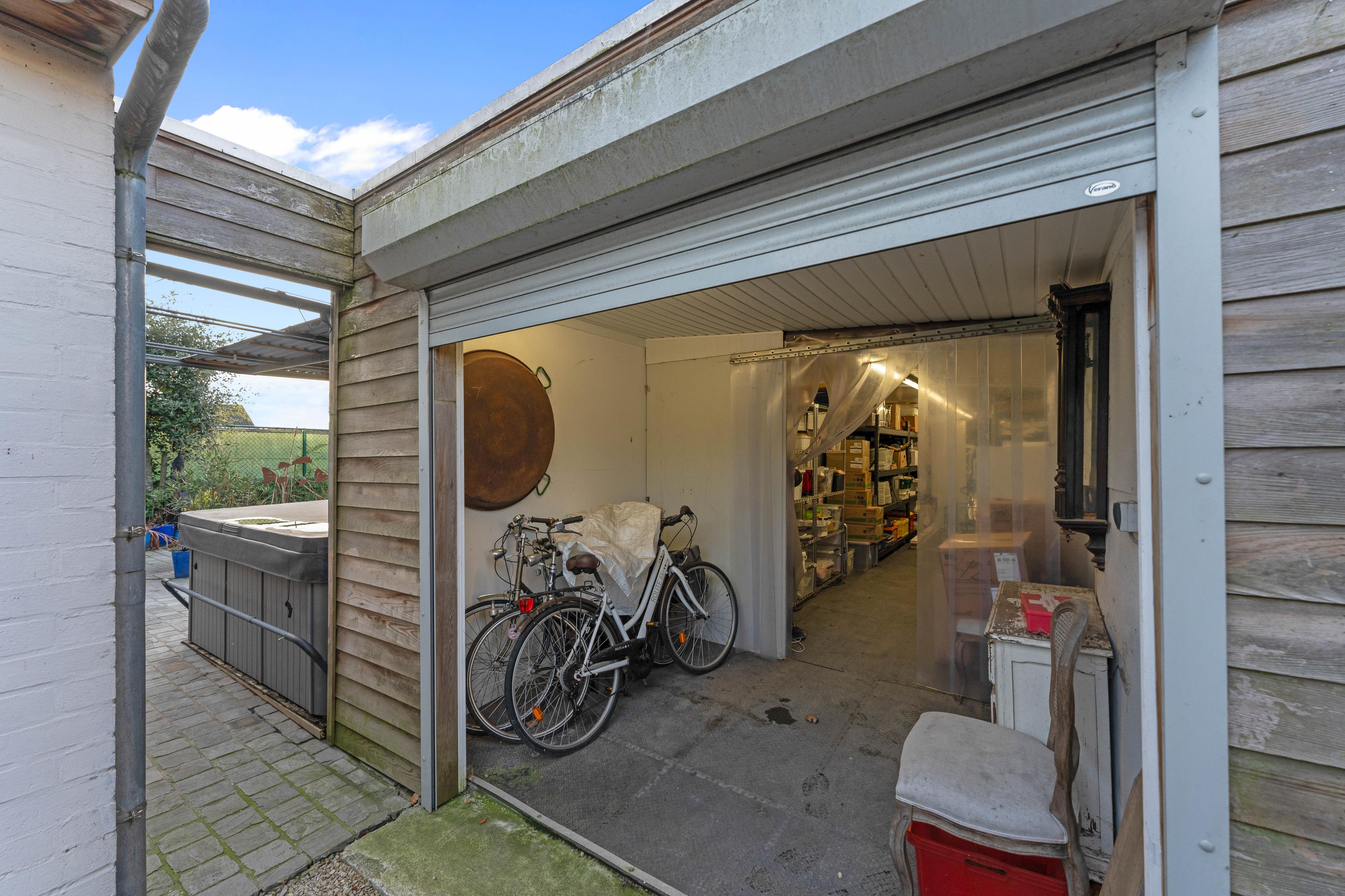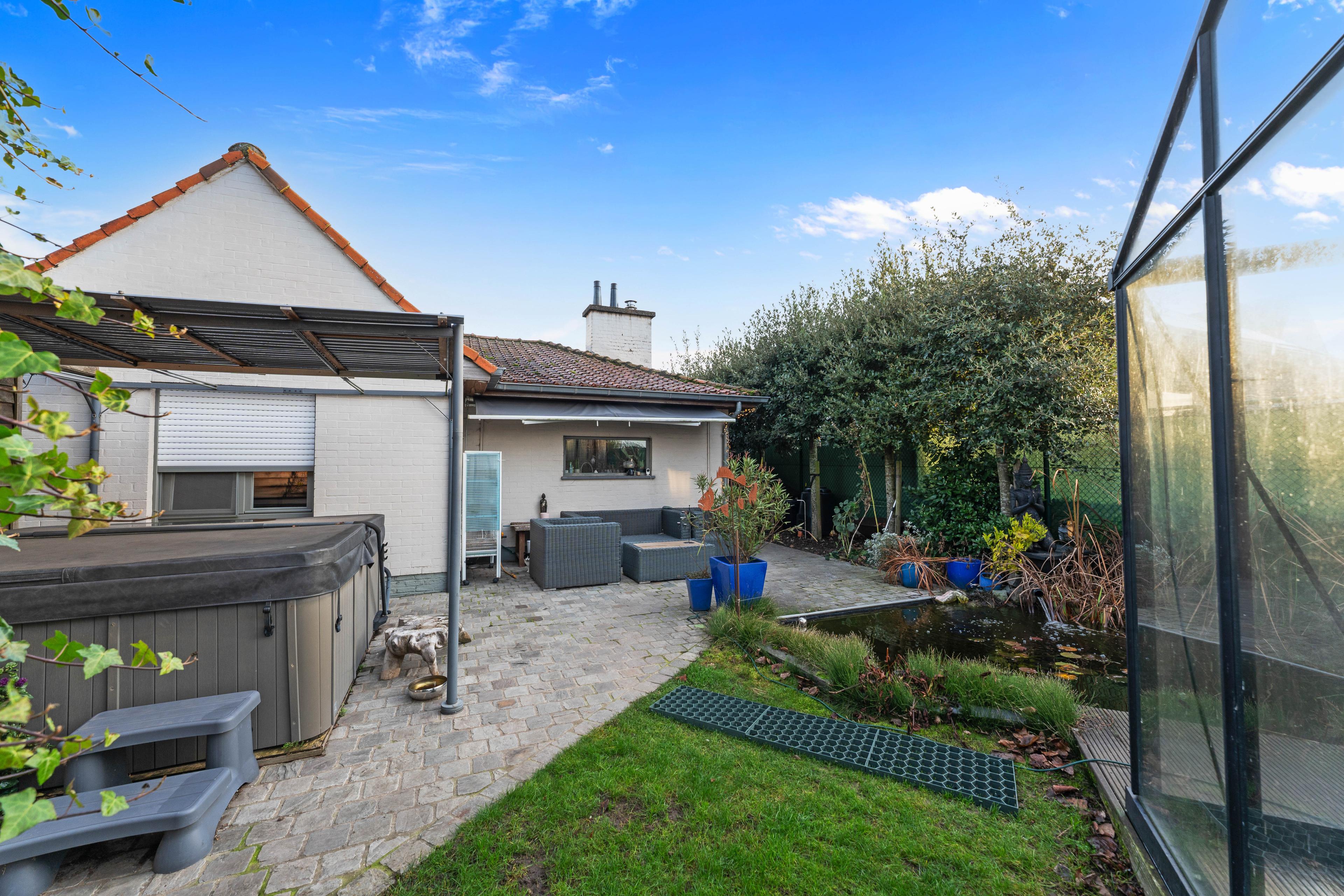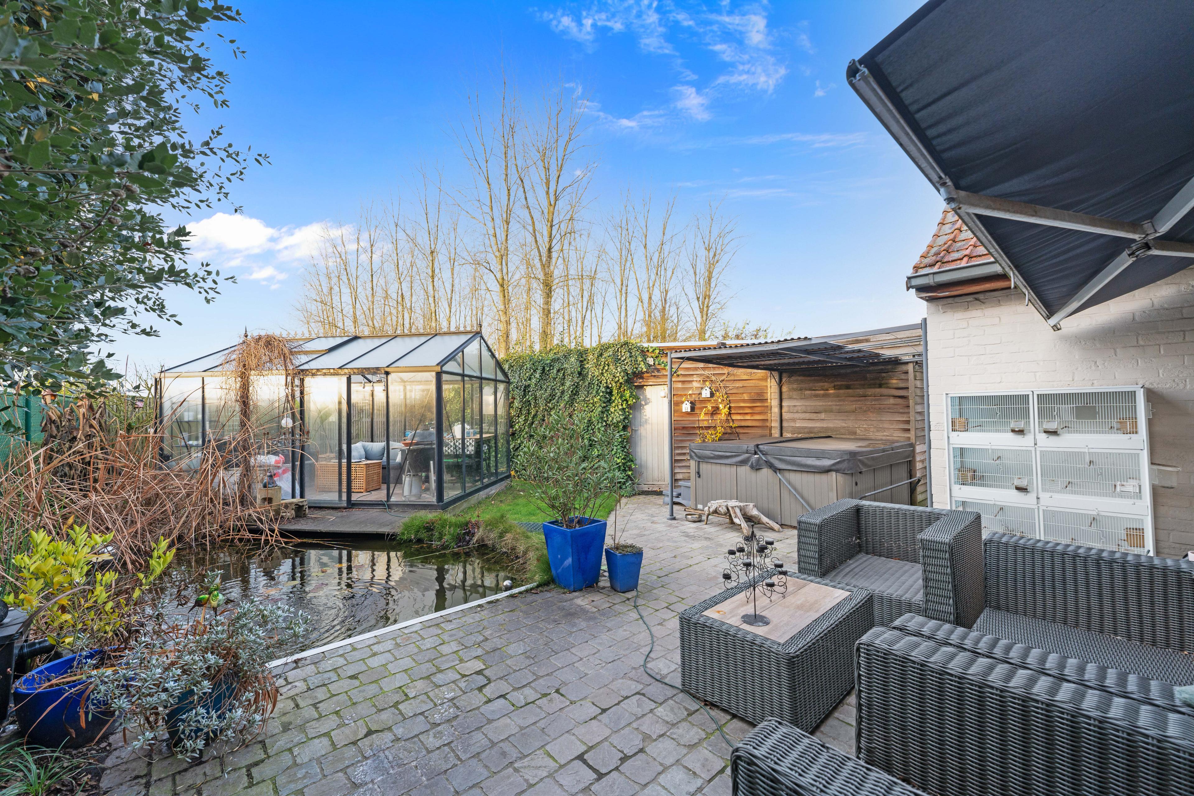 De tuin vormt een echte oase van rust, waar groen, water en privacy harmonieus samenkomen. Blikvanger is de stijlvolle glazen orangerie, die uitgeeft op de tuin en de vijver en dienstdoet als extra leefruimte waarin men het hele jaar door kan genieten van het buitengevoel. Het geheel wordt vervolledigd door een gezellig terras.