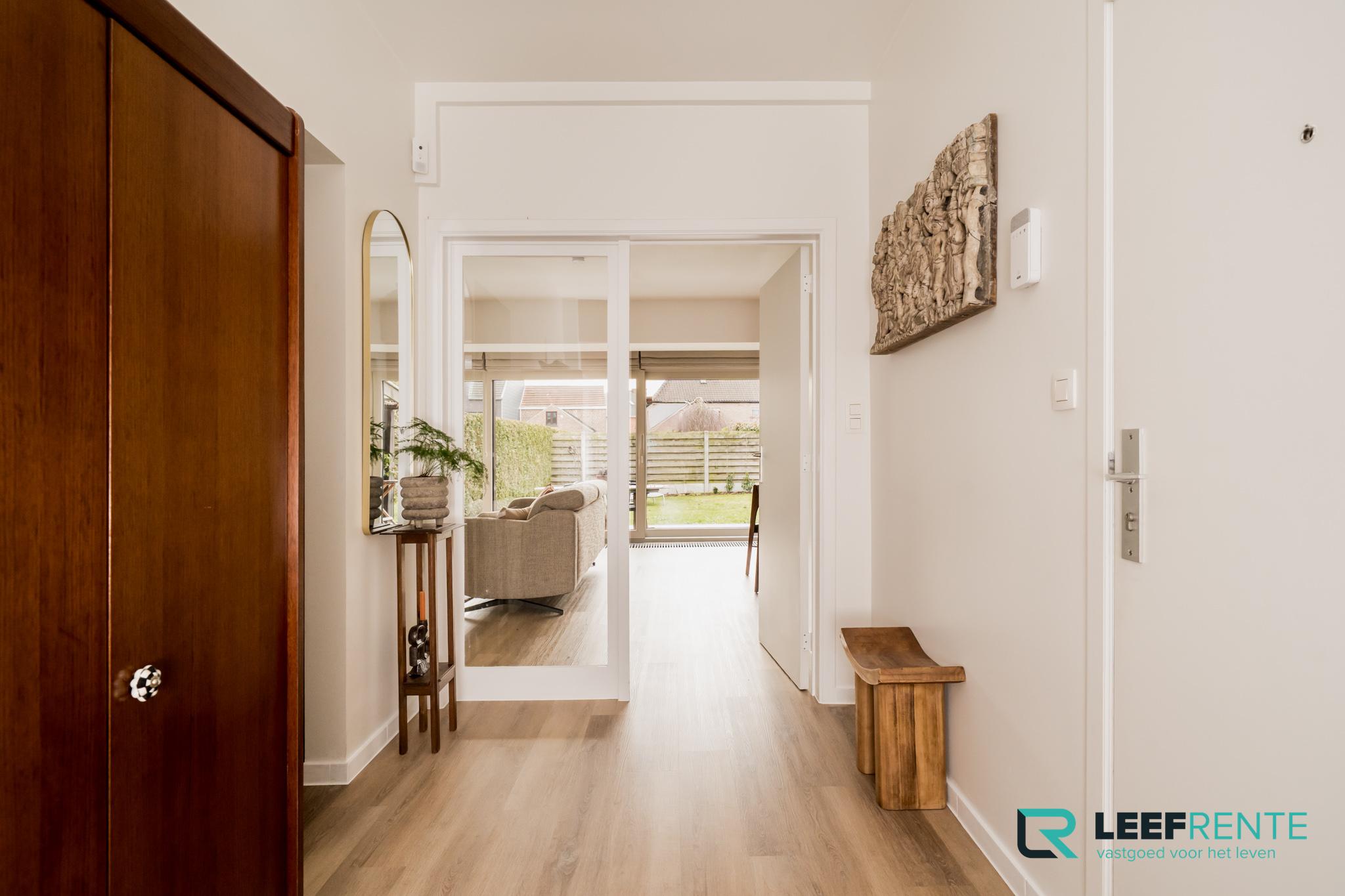 De ruime leefruimte geniet van veel lichtinval en geeft uit op het ruim terras met zonneluifel, en verder op de tuin.